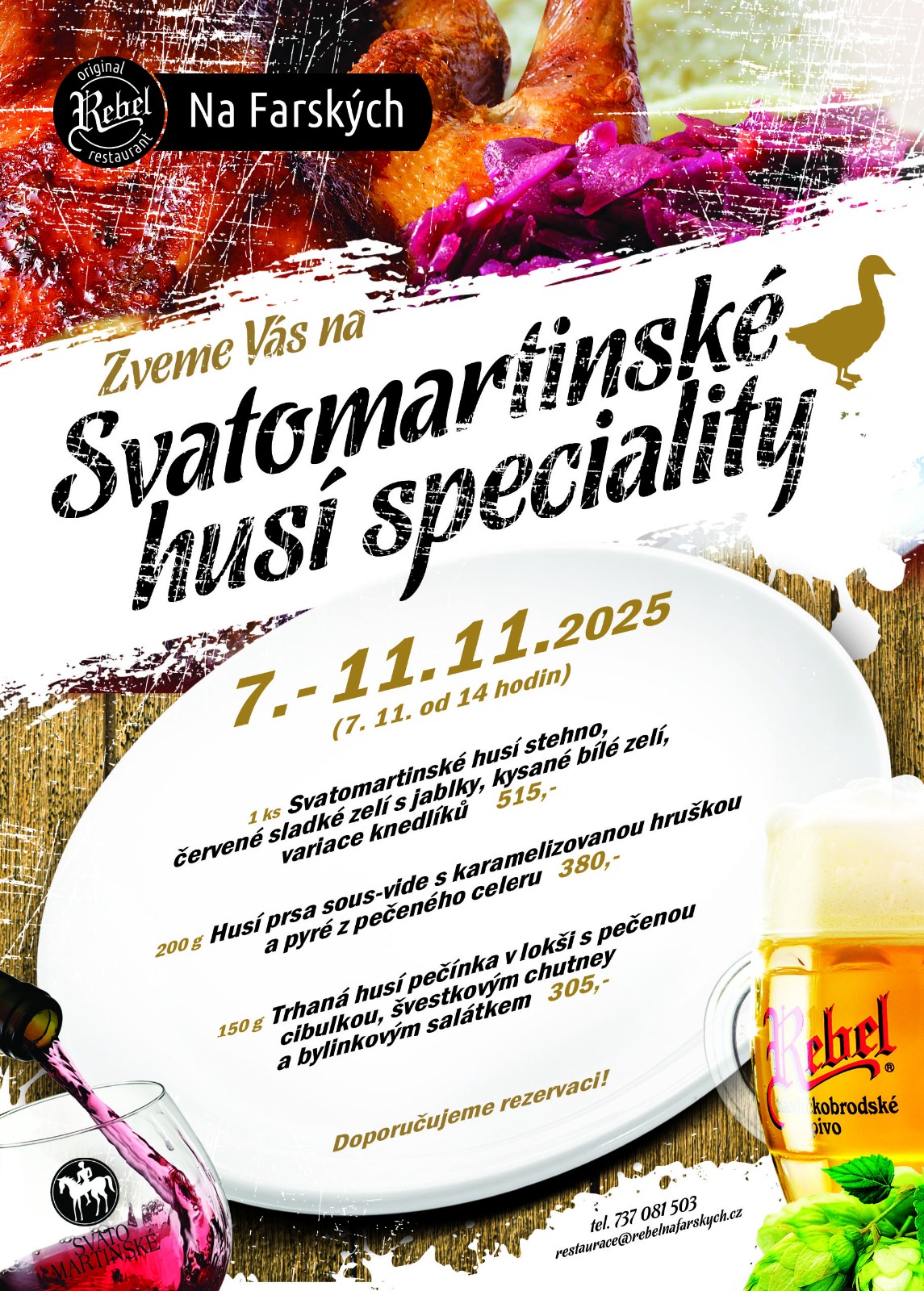 Doporučujeme rezervaci na tel. 737 081 503, email: restaurace@rebelnafarskych.cz případně si stůl rezervujte na našich stránkách http://www.rebelnafarskych.cz/rezervace-stolu/